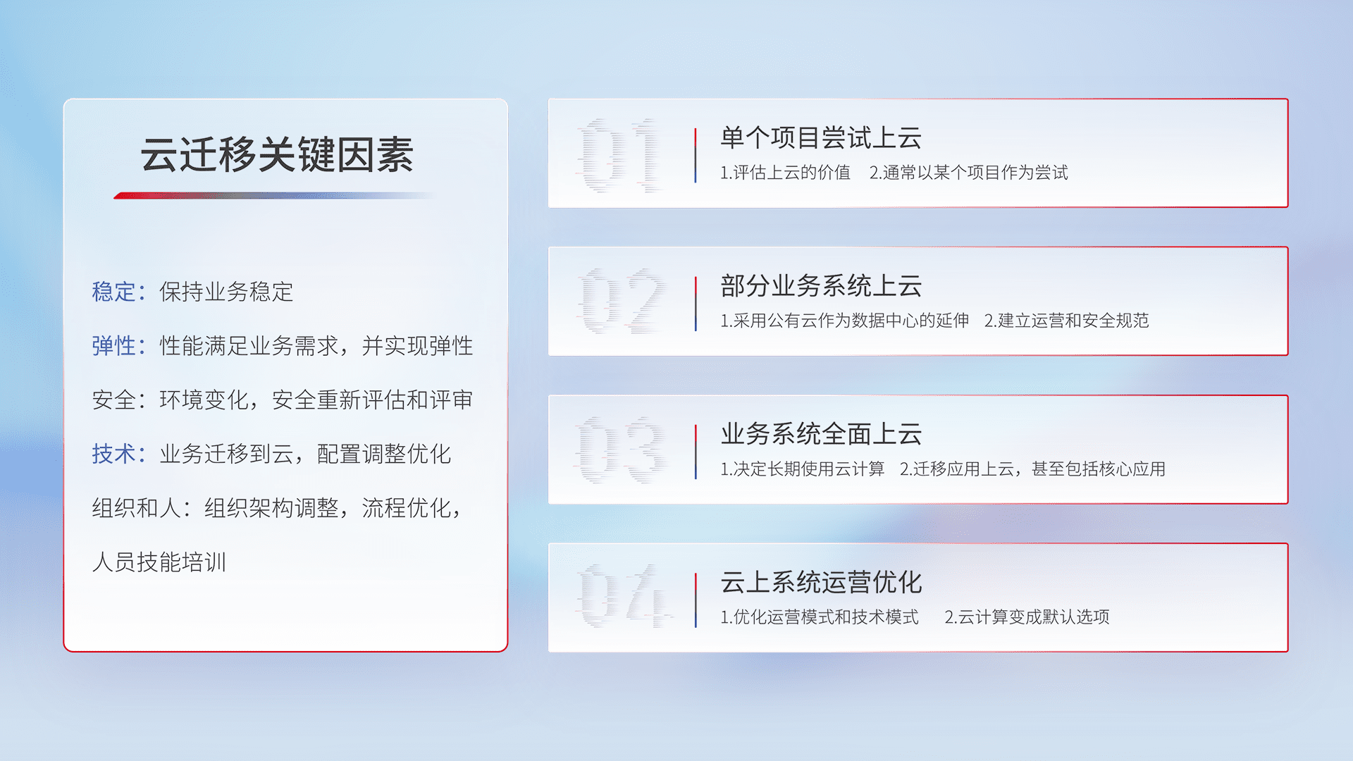 结合实际业务,,,从规划设计、、云平台选型、、云原生改造、、数据迁移、、集成交付,,迁移全过程为客户识别最佳上云路径,,,做好风险识别管理,,,设计网络架构、、身份权限、、安全审计合规、、、操作审计、、、、日志审计、、监控告警策略、、多站点容灾设计等,,,对云上基础设施进行整体规划,,,提升IT治理水平,,,以满足弹性、、高可用、、、高性能的需求。。。。